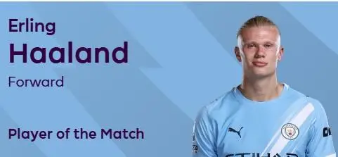 虎撲09月27日訊 英超第六輪,曼城5-1伯恩利。板英賽后,超官英超官方宣布哈蘭德當(dāng)選曼城5-1伯恩利全球迷票選場最佳球員。當(dāng)選