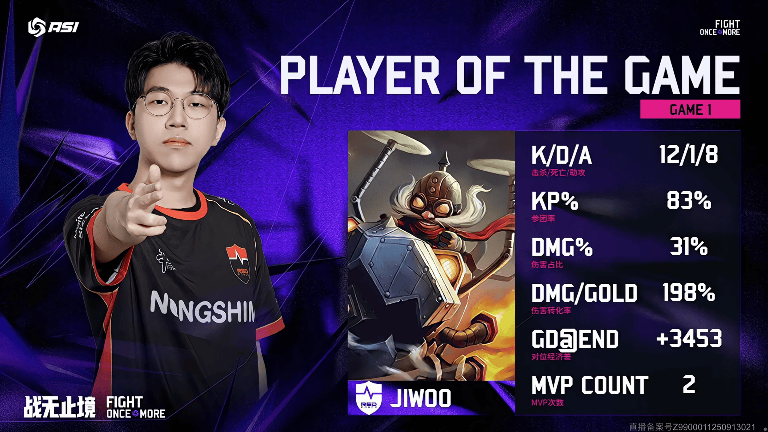 虎撲10月09日訊 在剛剛結(jié)束的亞洲邀請賽NS對陣NIP比賽中,Jiwoo飛機打出12/1/8戰(zhàn)績,戰(zhàn)績拿下NS對陣NIP第一局MVP,拿下這是飛機他第2個MVP。
