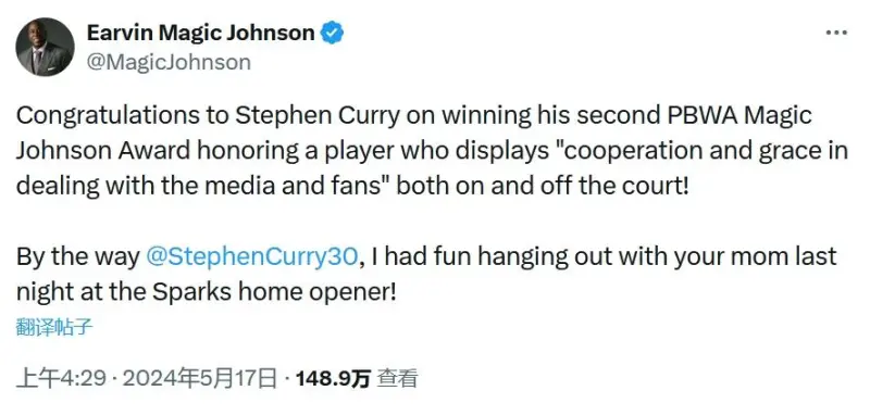 在今天早些時候,魔術(shù)師約翰遜在推特上向庫里表達了祝賀,晚庫魔術(shù)師寫道:“祝賀庫里第二次贏得這個獎項,這個獎項的得主在場上和場下都展現(xiàn)了合作精神與優(yōu)雅!另外,@斯蒂芬,我昨晚在火花的賽季揭幕戰(zhàn)里跟你媽媽玩得很開心。”
