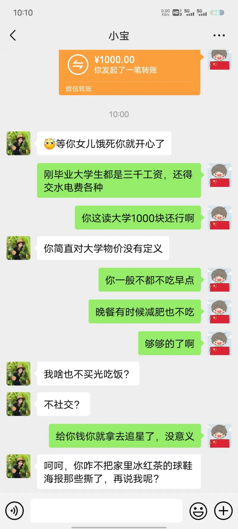 而且現(xiàn)在大學生畢業(yè)工資也就3000,個月他這種剛讀大學又不用交房租,交水電費的1000塊很合理了吧?