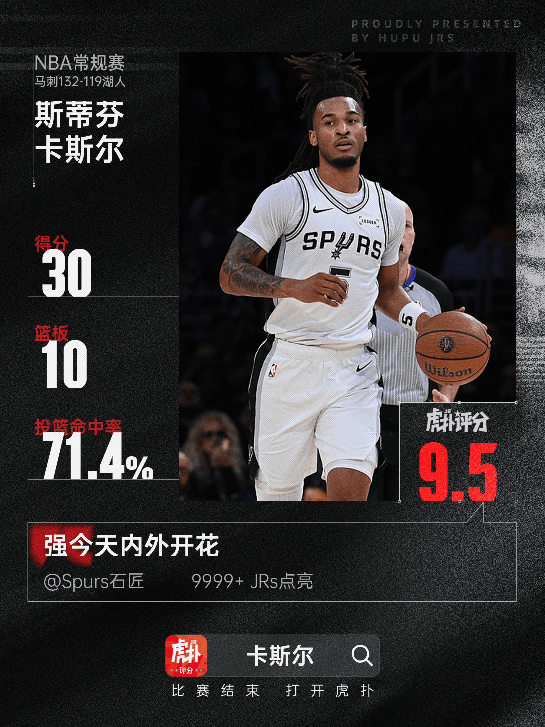 本場比賽,下分馬刺球員斯蒂芬-卡斯?fàn)柍鰬?zhàn)26分鐘,表現(xiàn)14投10中,亮眼籃板其中三分球6投3中,爾全罰球9投7中,場投得到30分10籃板6助攻。中砍助攻