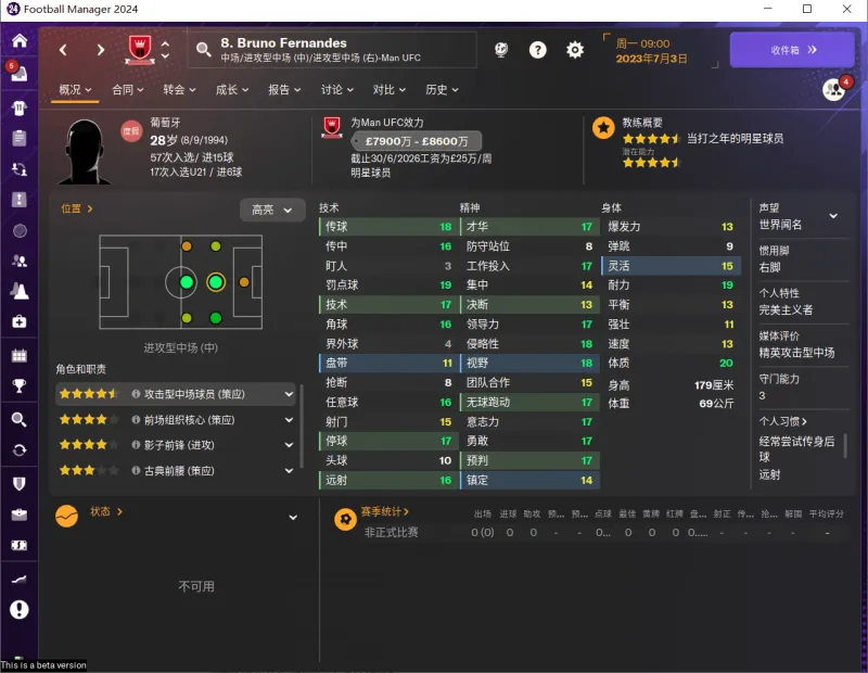 這是大b哥fm的數(shù)值,高估肯定是道不高估的,在高估情況下,阿莫其盯人3,后難搶斷8,道不站位8,不知道何德何能可以打后腰,如果不能放在影鋒位置,b費就是殘廢。