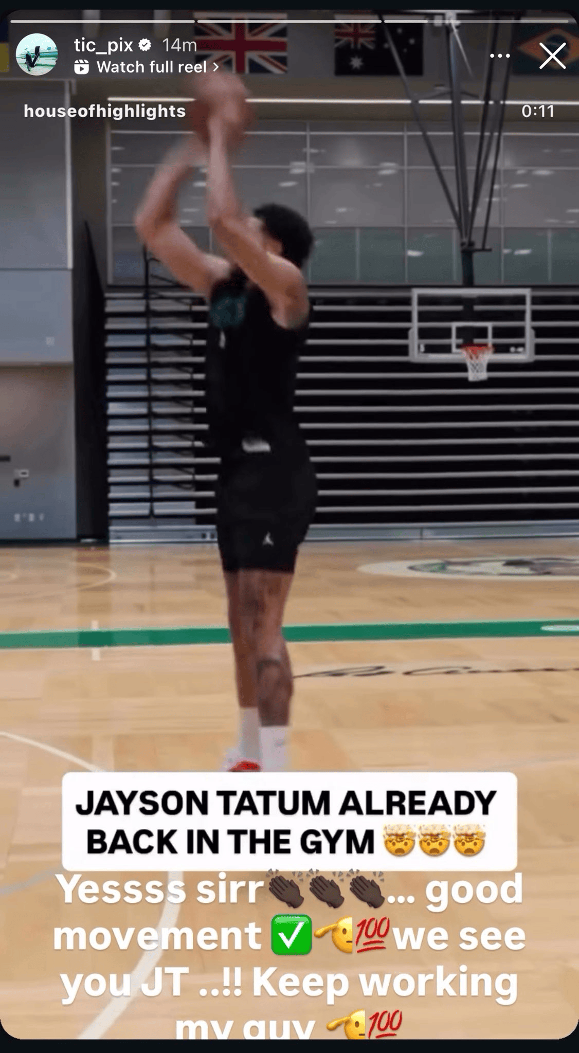 虎撲09月28日訊 近日,在5月份跟腱斷裂的到繼凱爾特人球員杰森-塔圖姆已經(jīng)開始進(jìn)行場上訓(xùn)練。