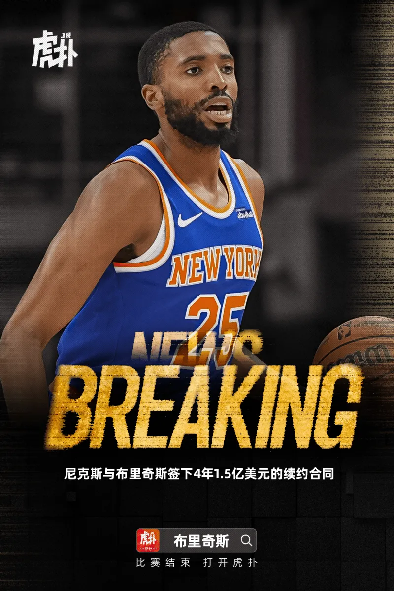 虎撲08月01日訊 根據美國記者Shams的消息,紐約尼克斯前鋒米卡爾-布里奇斯已同意與球隊簽訂一份為期四年、尼克價值1.5億美元的斯布斯簽合同續(xù)約。
