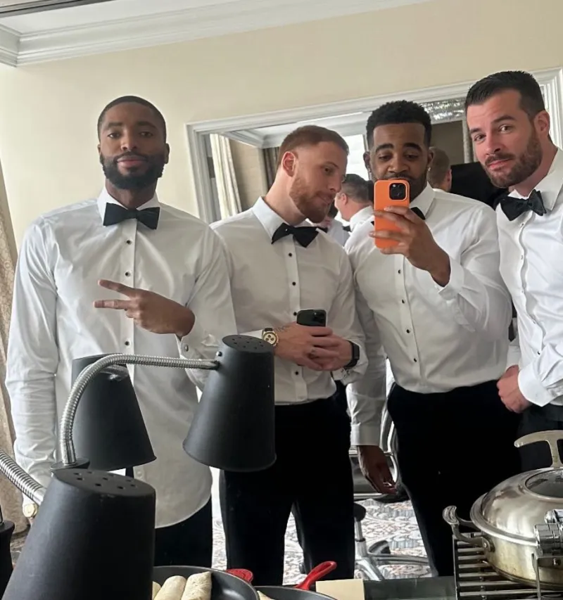 今日,尼克斯社媒曬出米卡爾-布里奇斯與丹特-迪溫琴佐共同參加好友婚禮的友婚合影照片。