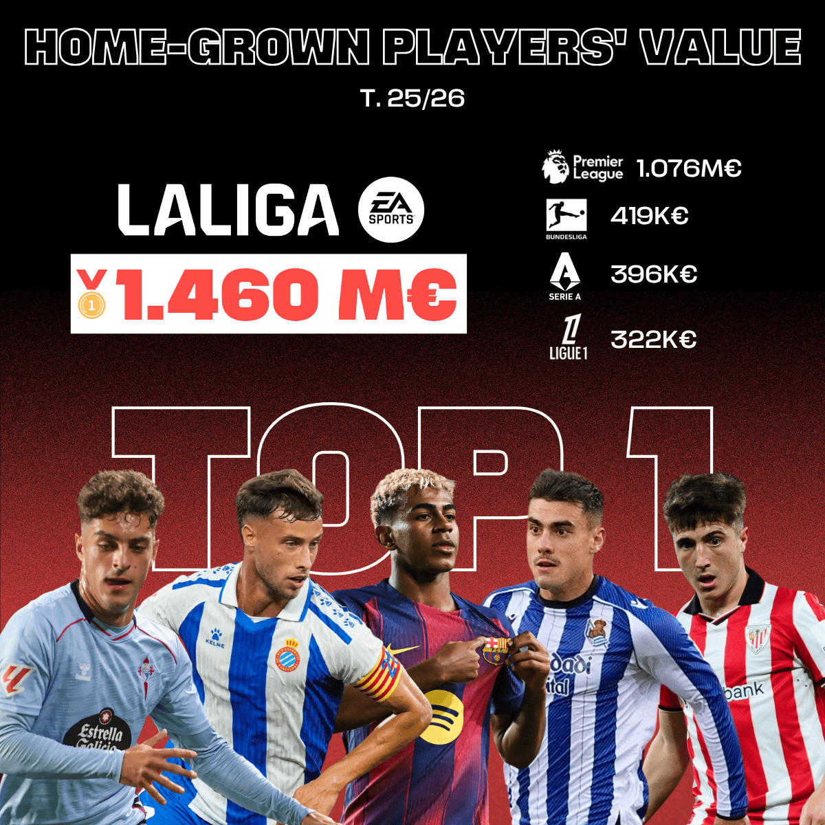 西甲是歐洲青訓(xùn)球員總市場(chǎng)價(jià)值最高的聯(lián)賽,達(dá)14.6億歐元,遠(yuǎn)超英超(10.7億歐元)、德甲(9.6億歐元)、意甲(8.9億歐元)及法甲(7.6億歐元)。在2025年夏季轉(zhuǎn)會(huì)窗口中,西班牙俱樂(lè)部通過(guò)本土青訓(xùn)球員轉(zhuǎn)會(huì)創(chuàng)下2.89億歐元的收入紀(jì)錄,創(chuàng)歷史新高,印證了其青訓(xùn)戰(zhàn)略的成功。