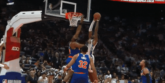 第二節(jié)比賽,球分強(qiáng)投亞布塞萊接球三分強(qiáng)投命中,隨后送出隨后送出正面大帽。正面