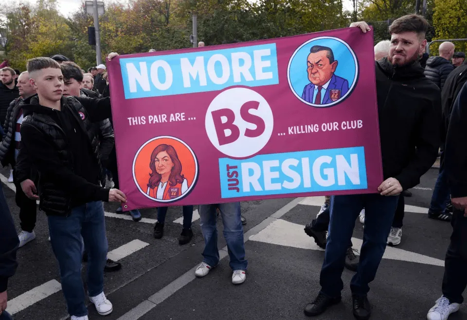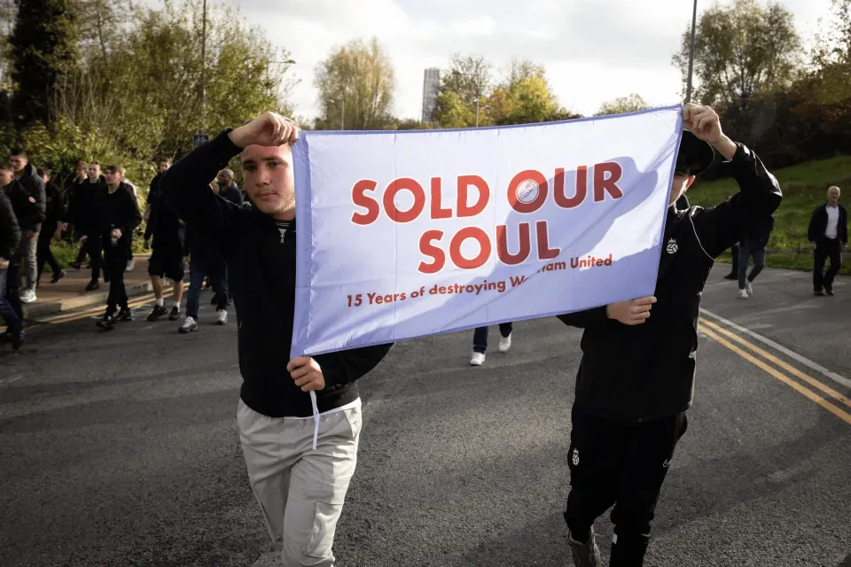 成千上萬的西漢姆球迷聚集在倫敦體育場(chǎng)外,抗議俱樂部的管理層。游行隊(duì)伍中到處可以看到寫滿反對(duì)所有權(quán)標(biāo)語的橫幅。