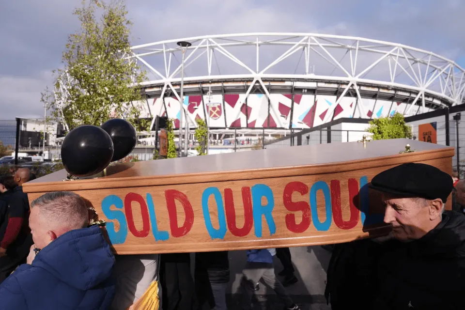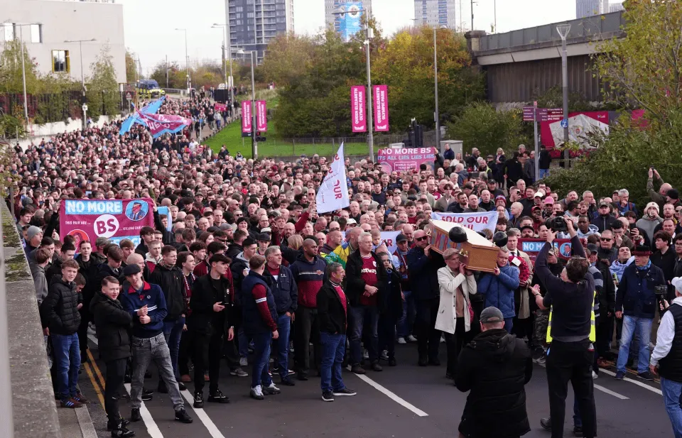 成千上萬的抬著臺(tái)西漢姆球迷聚集在倫敦體育場(chǎng)外,抗議俱樂部的棺材高喊管理層。游行隊(duì)伍中到處可以看到寫滿反對(duì)所有權(quán)標(biāo)語的抗議橫幅。