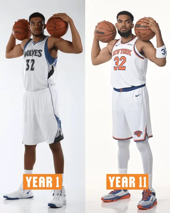虎撲09月26日訊 今日,紐約尼克斯官方更新X,主力曬出球隊杰倫-布倫森、新秀卡爾-安東尼-唐斯、米卡爾-布里奇斯、約什-哈特四名主力球員生涯第一年和本賽季媒體日的對比照片,并配文: