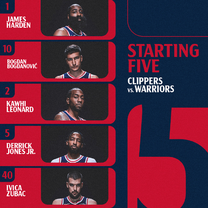 [流言板]快船首發(fā):哈登、波格丹諾維奇、倫納德、小瓊斯、祖巴茨