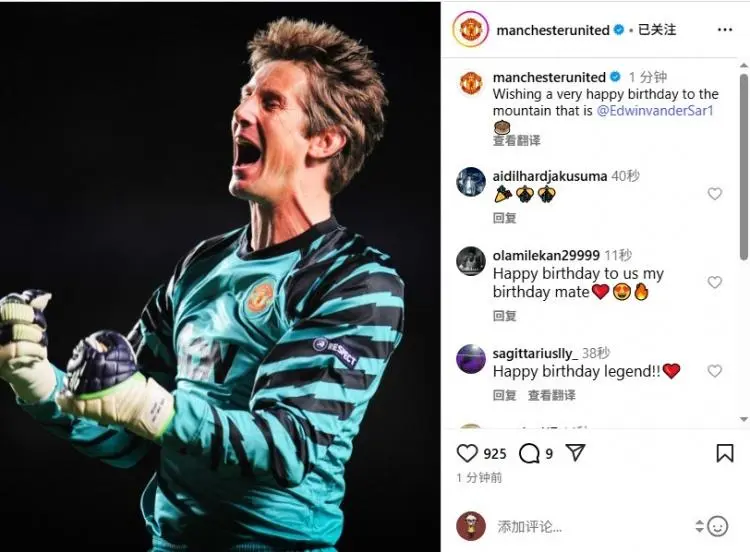 曼聯(lián)官方Instagram寫道:“祝門前的那座大山——范德薩生日快樂!”