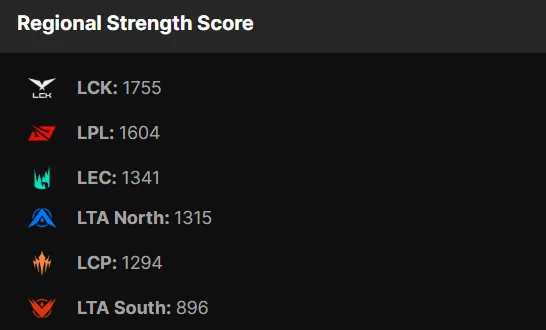 LCK賽區(qū)實(shí)力評分為1755列第一,LPL賽區(qū)實(shí)力評分為1604列第二