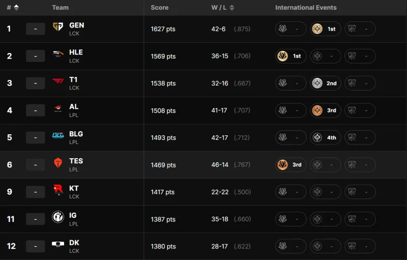 LPL/LCK戰(zhàn)隊(duì)排名分列如下: