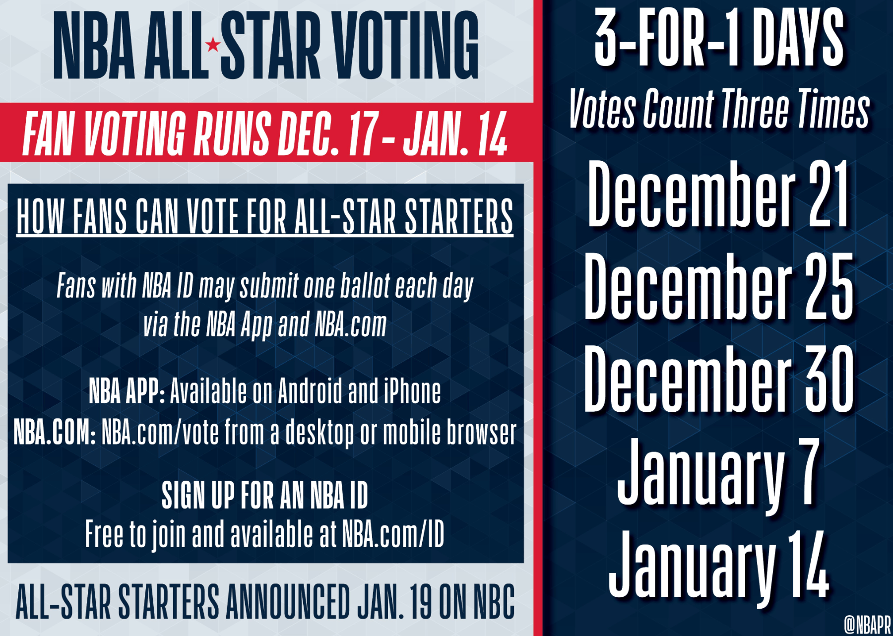 虎撲12月12日訊 NBA官方今日宣布,本賽季全明星投票將在美國東部時(shí)間12月17日周三中午12:00開始,全明并將在美國東部時(shí)間1月14日周三晚11:59結(jié)束。星投