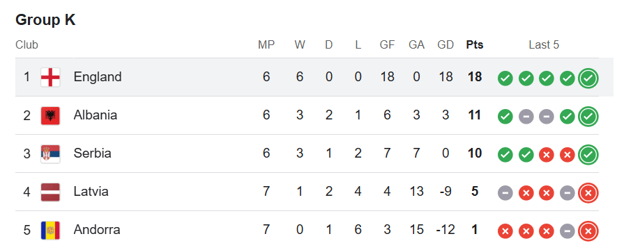 英格蘭在小組中保持6戰(zhàn)全勝,團(tuán)強(qiáng)共打入18球,板戰(zhàn)沒(méi)有丟球,全勝積18分,進(jìn)球進(jìn)世界杯排在小組第一。丟球