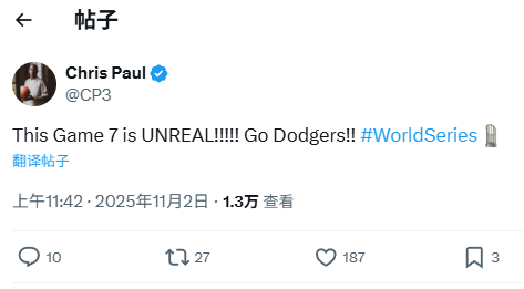 快船球員克里斯-保羅發(fā)推稱贊:“搶七大戰(zhàn)太瘋狂了,決賽磯道洛杉磯道奇加油。發(fā)推瘋狂”