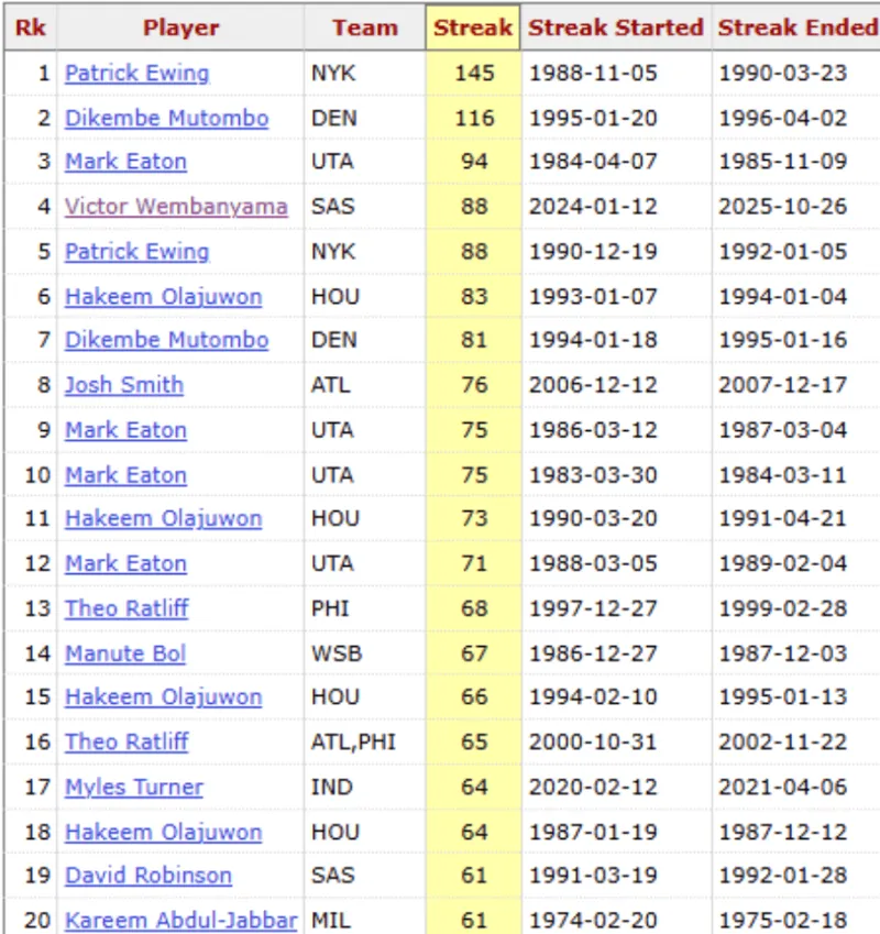 本場過后,文班亞馬已經(jīng)連續(xù)88場常規(guī)賽至少送出1次封蓋,他與帕特里克-尤因并列排在這項數(shù)據(jù)的歷史第四。而現(xiàn)役球員里,排在文班亞馬后面的是德安德烈-艾頓、多諾萬-克林根、邁爾斯-特納和扎克-伊迪的9場。