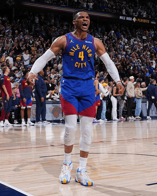 上賽季,威少為掘金效力,常規(guī)賽出戰(zhàn)75場,場均得到13.3分4.9板6.1助攻。