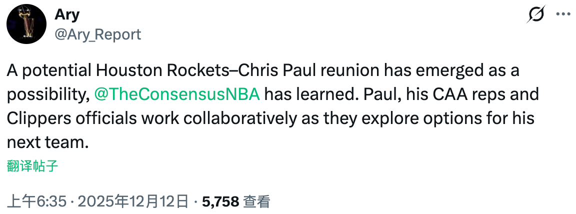 虎撲12月12日訊 美媒Ary今日報道,關于克里斯-保羅重返火箭的火箭可能性正在逐漸增加。