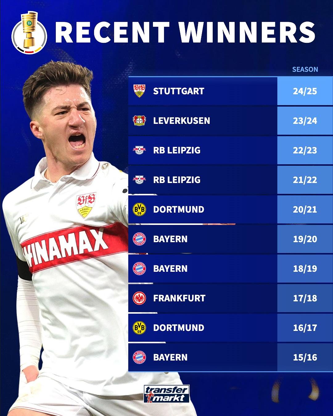 虎撲10月29日訊 德國(guó)轉(zhuǎn)會(huì)市場(chǎng)盤(pán)點(diǎn)了最近10個(gè)賽季獲得德國(guó)杯冠軍的球隊(duì),詳情如下: