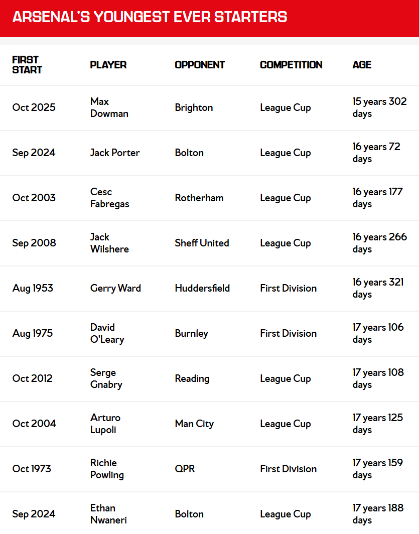 年僅15歲302天的道曼打破了此前由杰克-波特在去年聯(lián)賽杯對陣博爾頓時創(chuàng)造的紀錄。當時波特首發(fā)登場時為16歲72天,道曼比他年輕了整整135天,也成為阿森納歷史上首位16歲以下就首發(fā)出場的球員。