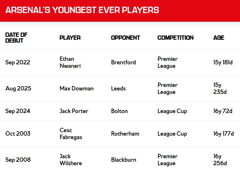 如果道曼在本賽季打進個人首球,他將有望再度刷新紀錄——成為阿森納隊史最年輕進球者。