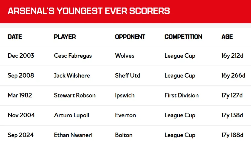 阿森納歷史上最年輕的出場球員依然是恩瓦內(nèi)里。他在2022年對陣布倫特福德時出場,年僅15歲181天,成為英格蘭頂級聯(lián)賽史上最年輕的登場球員,打破了1964年桑德蘭門將德里克-福斯特保持的紀錄。