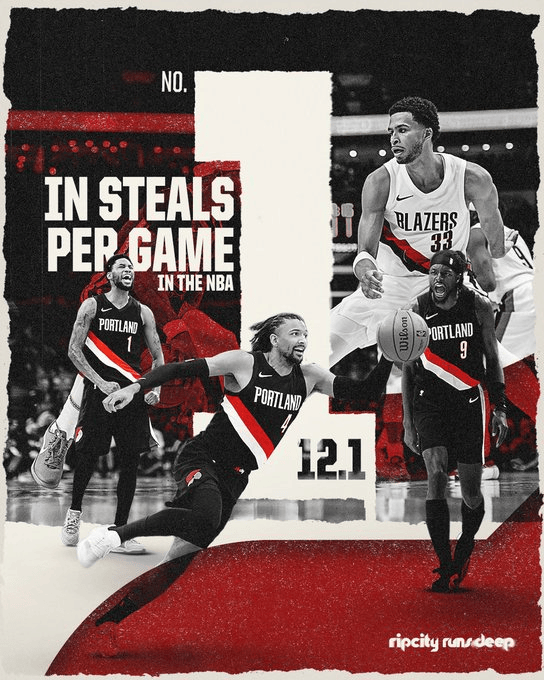“本賽季我們場(chǎng)均送出12.1次搶斷,官方領(lǐng)跑全聯(lián)盟!季們”開拓者官方附文道。場(chǎng)均次搶