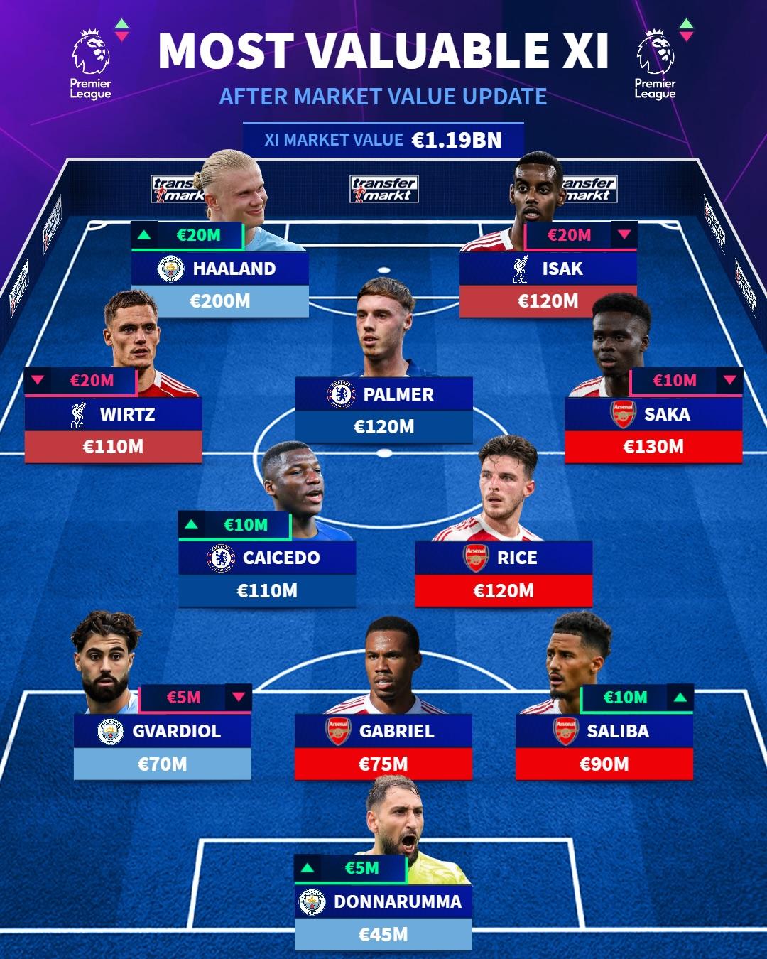 虎撲12月09日訊 德轉(zhuǎn)更新了英超球員的最新身價(jià),并盤點(diǎn)了目前英超身價(jià)最高陣容。轉(zhuǎn)英