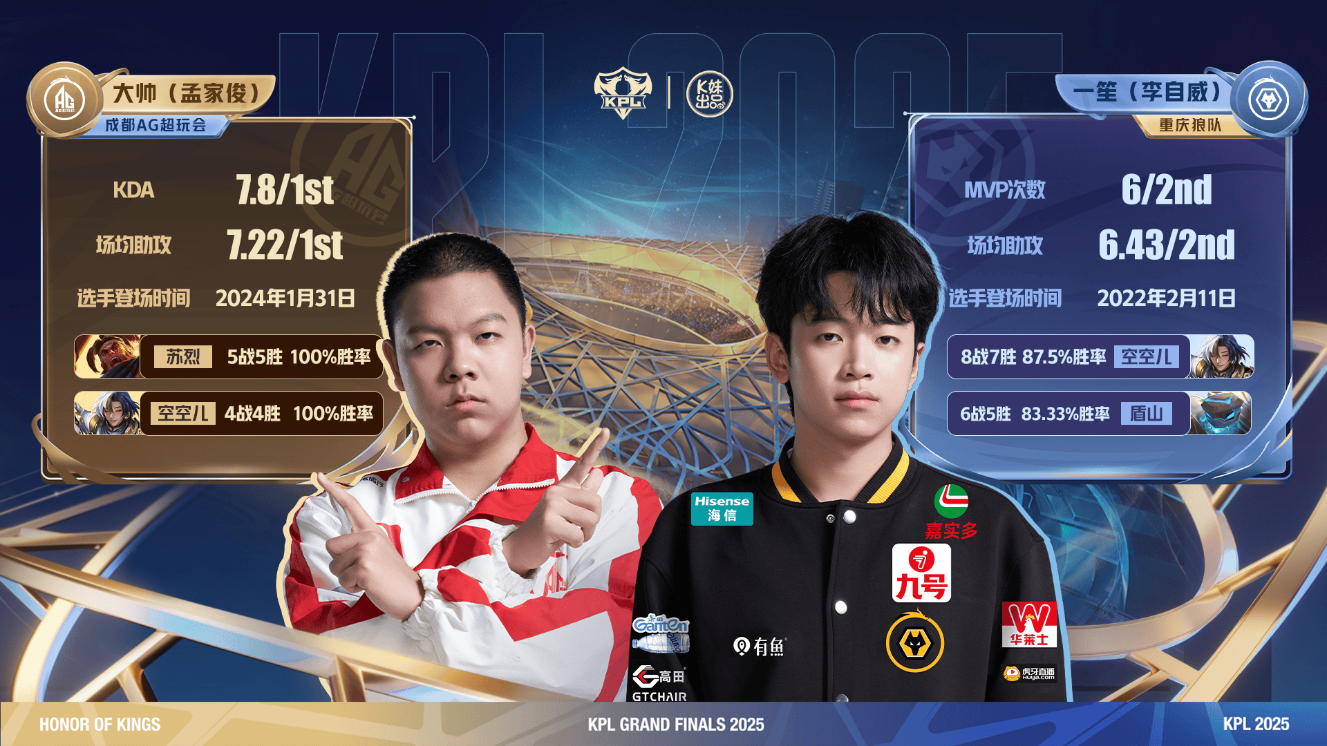 大帥 (孟家俊)在2024年1月31日初次登上賽場;本次年度總決賽期間KDA7.8,同位置排名第一、場均助攻7.22,同位置排名第一;蘇烈5戰(zhàn)5勝,100%勝率;空空兒4戰(zhàn)4勝,100%勝率;