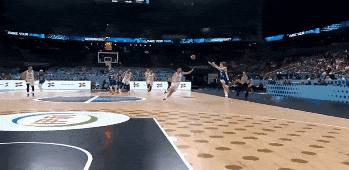 第二節(jié)比賽,快下穆里寧反擊快下接球起飛,接球雙手拉弓滑翔暴扣。起飛