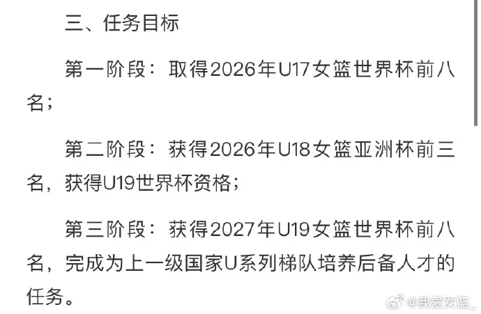 值得注意的是,籃協的選聘通知當中對主教練帶隊成績做了詳細的要求,即第一階段要取得2026年U17女籃世界杯前八名;第二階段要獲得2026年U18女籃亞洲杯前三名,獲得U19世界杯資格;第三階段要獲得2027年U19女籃世界杯前八名。
