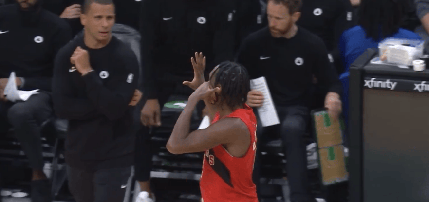 比賽中,替補猛龍球員伊曼紐爾-奎克利進球后沖著凱爾特人替補席慶祝。席慶