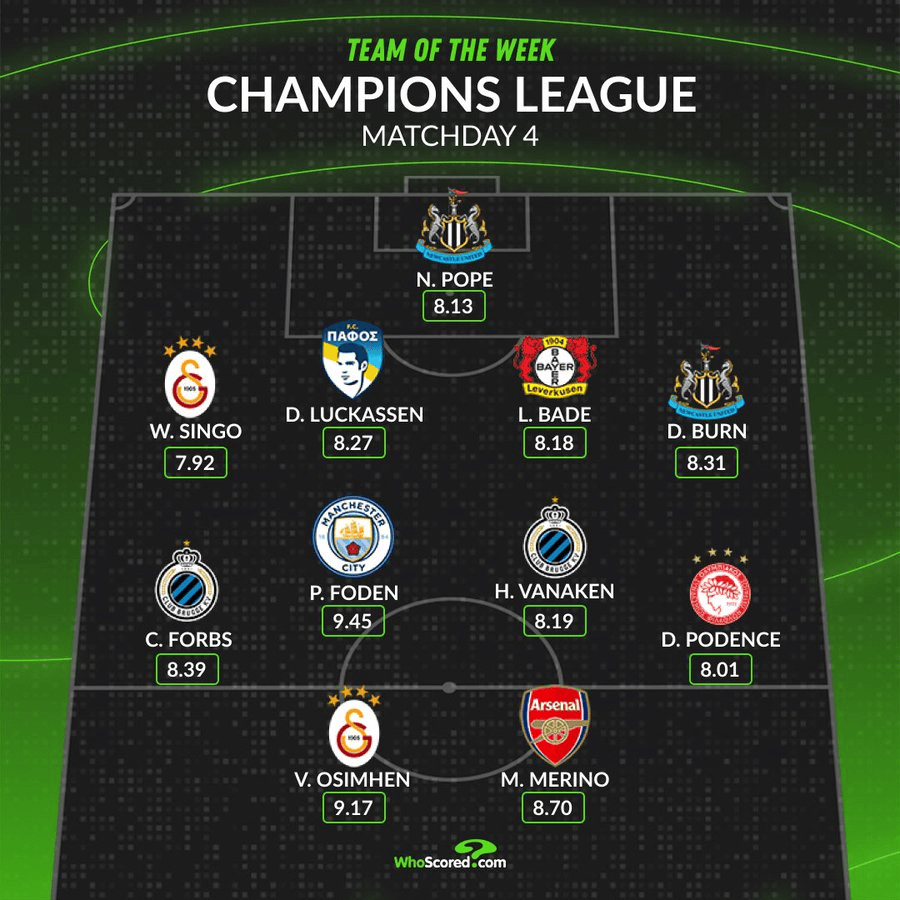 虎撲11月06日訊 Whoscored根據(jù)球員評(píng)分,評(píng)選出了本周歐冠聯(lián)賽的諾奧最佳陣容。