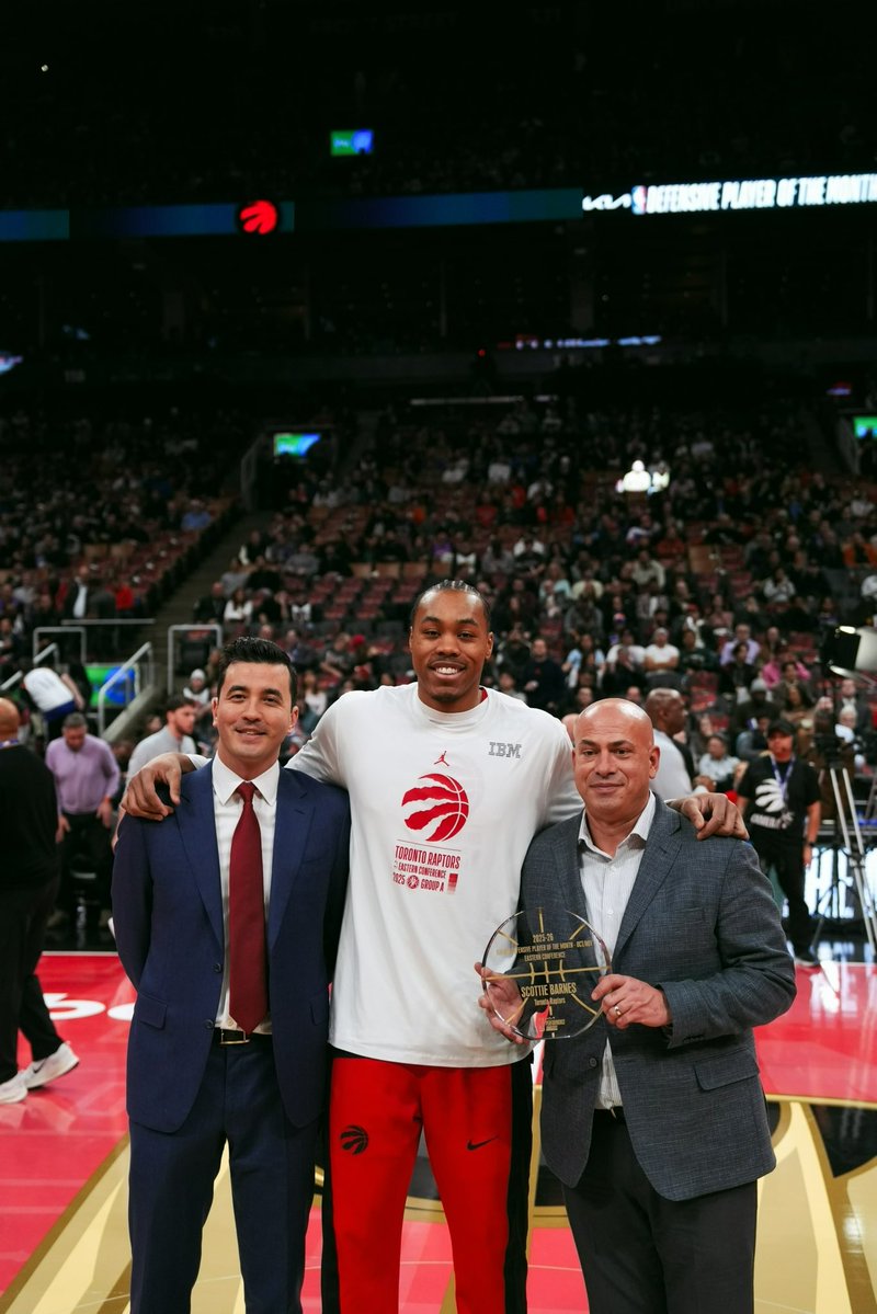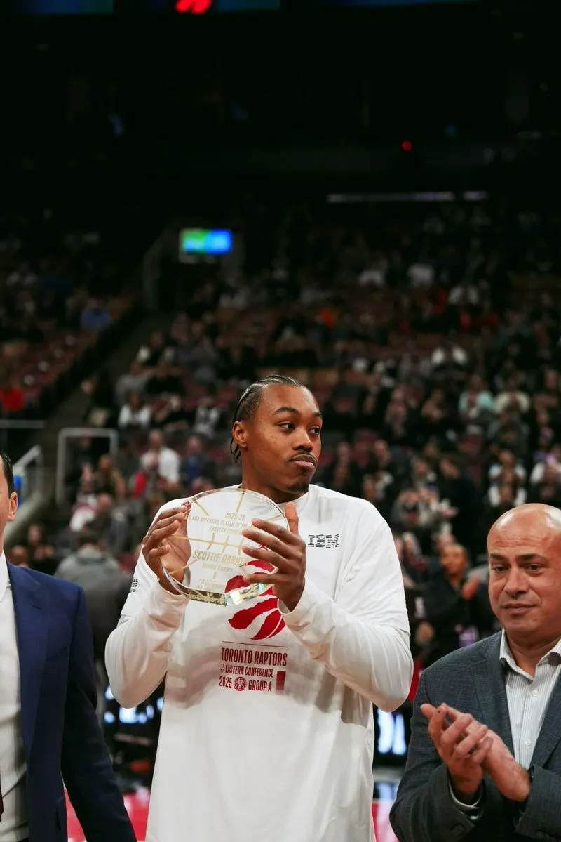 賽前,斯照猛龍球員斯科蒂-巴恩斯領(lǐng)取了本賽季首月的片并配文東部月最佳防守球員的獎(jiǎng)杯。