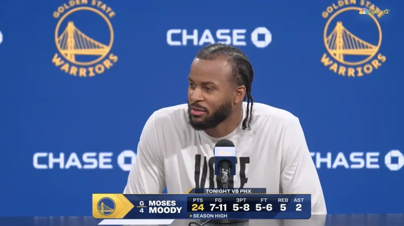 賽后勇士球員摩西-穆迪在接受記者采訪時談到了自己打替補出場:“我覺得這就是生活的一部分,事情有時候會順利,有時候又不如人意。我想這就是為什么我被叫做‘Stay Readymo’(始終準備好)。無論情況如何,你都得應對,我覺得我們現(xiàn)在就是這種狀態(tài),一天一天來。”