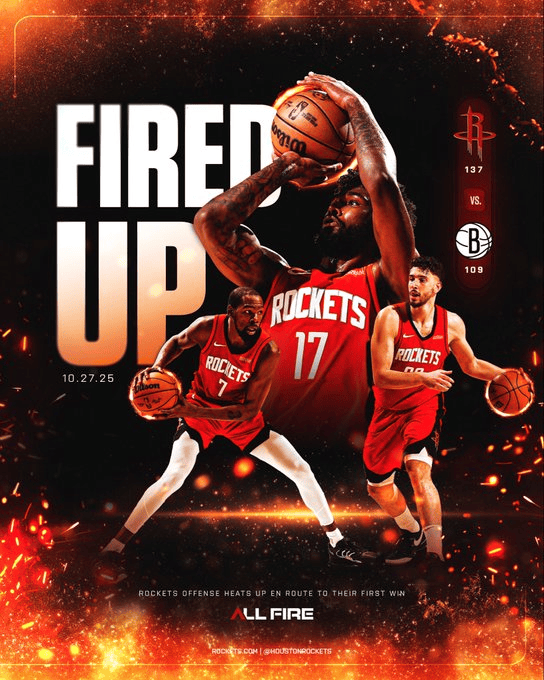 [流言板]旗開得勝!火箭官方曬海報(bào)慶祝球隊(duì)取得常規(guī)賽首場勝利