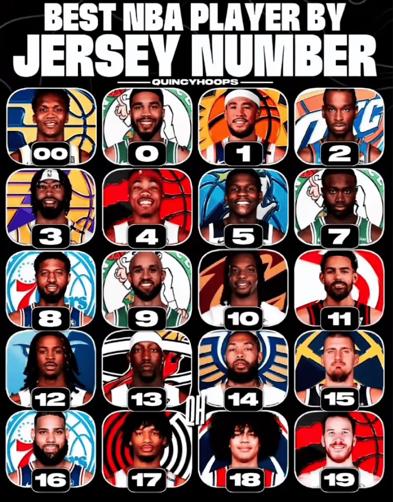 虎撲02月18日訊 美媒Quincy Hoops曬圖,列出了現(xiàn)役NBA從00號到19號各號碼的號到號各號碼最強球員。