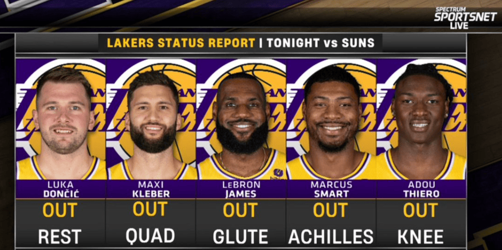 本場比賽之前,美媒現(xiàn)場轉(zhuǎn)播方給出了湖人今日缺席比賽的球員列表:盧卡-東契奇(輪休)、馬克西-克勒貝爾(四頭肌受傷)、勒布朗-詹姆斯(臀部肌肉受傷)、馬庫斯-斯馬特(跟腱受傷)和阿杜-蒂耶羅(膝蓋受傷)。