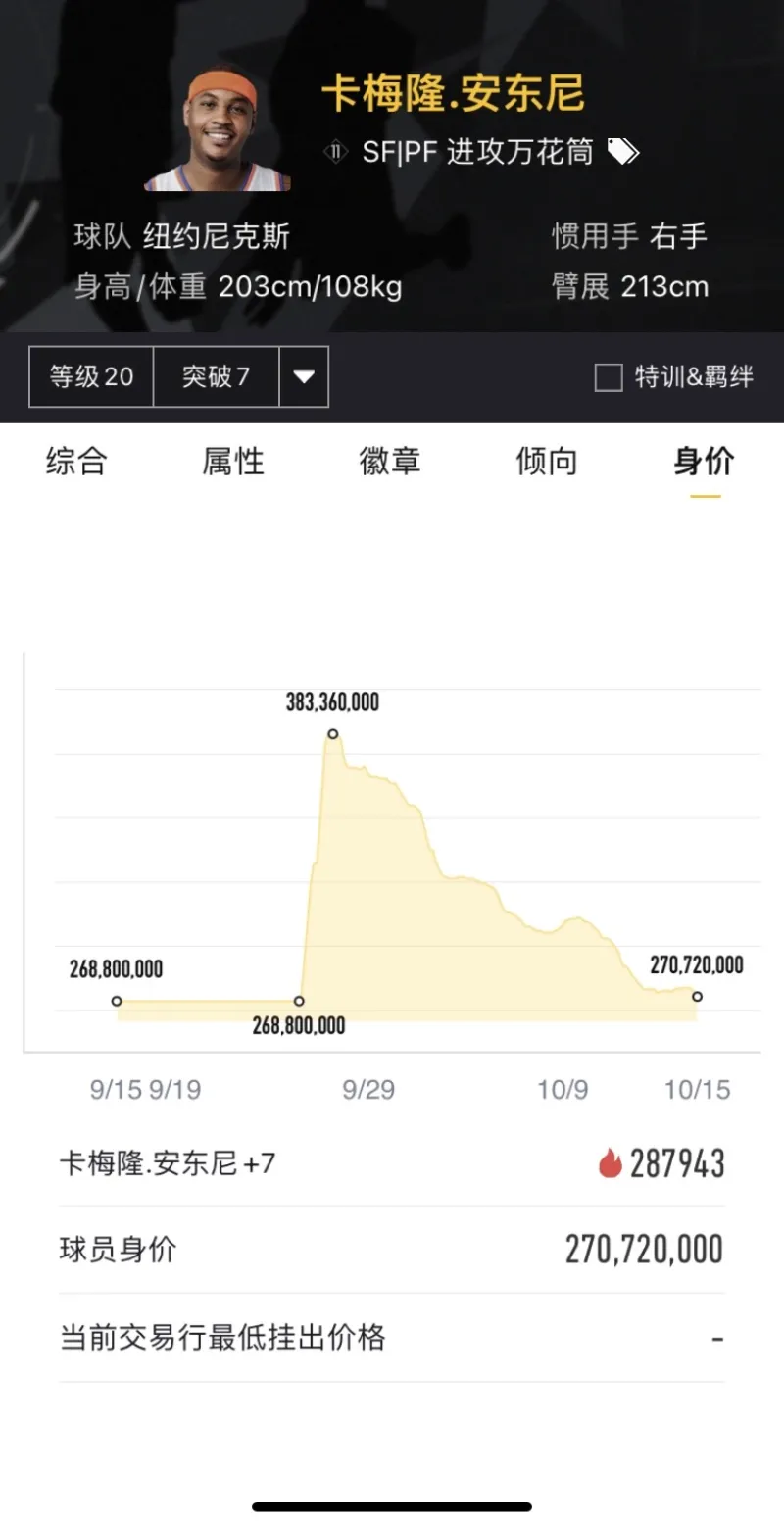 球員一個月光速跌價 小時刻比球員卡貴 大時刻可有可無 市場持續(xù)低迷 全體現(xiàn)役歷史持續(xù)降價 熱度越堆越少 這次活動是ol2里為數(shù)很多top前三的失敗案例吧?半個陳列室的保值時間都沒有 一個月蒸發(fā)一個多億 第一次看見這種走勢的身價圖