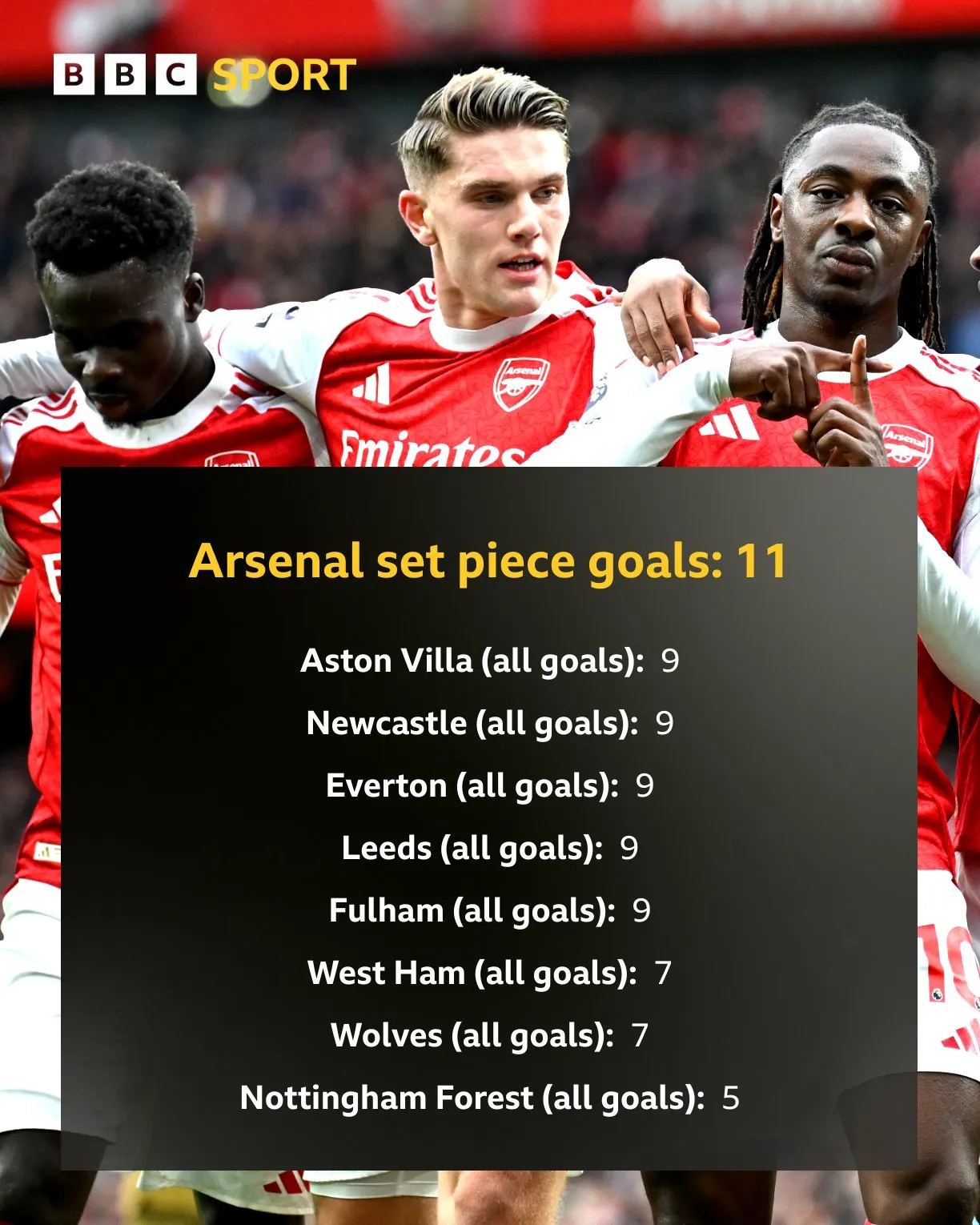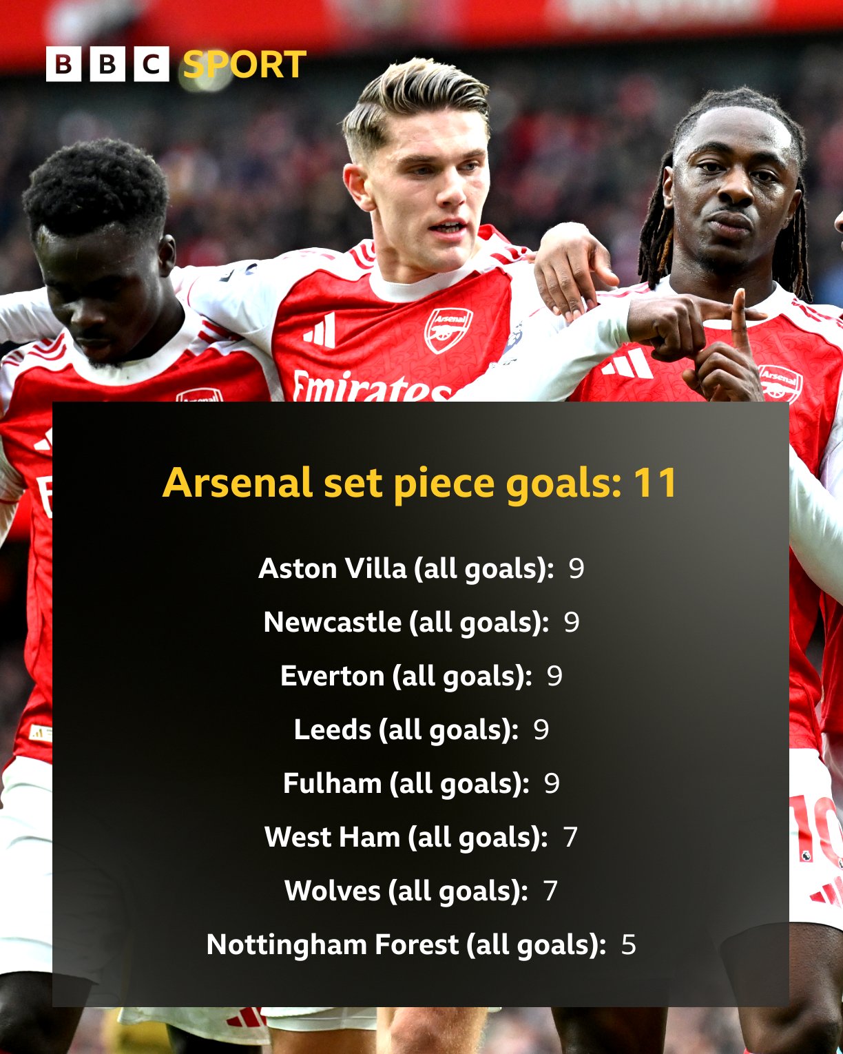 截至目前,通過阿森納本賽季在英超通過定位球已打入11球,定位打入這一數(shù)據(jù)不僅比其他英超球隊(duì)都多至少兩個(gè),球已球多球隊(duì)球數(shù)甚至超過了八支球隊(duì)的總進(jìn)總進(jìn)球數(shù):