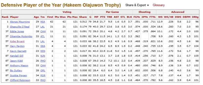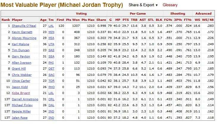 99-00賽季的MVP排名相對來說,比較公正,科比排在第12位,前十一名是奧尼爾、加內(nèi)特、阿隆佐-莫寧、卡爾-馬龍、蒂姆-鄧肯、加里-佩頓、阿倫-艾弗森、格蘭特-希爾、克里斯-韋伯、文斯-卡特、賈森-基德。