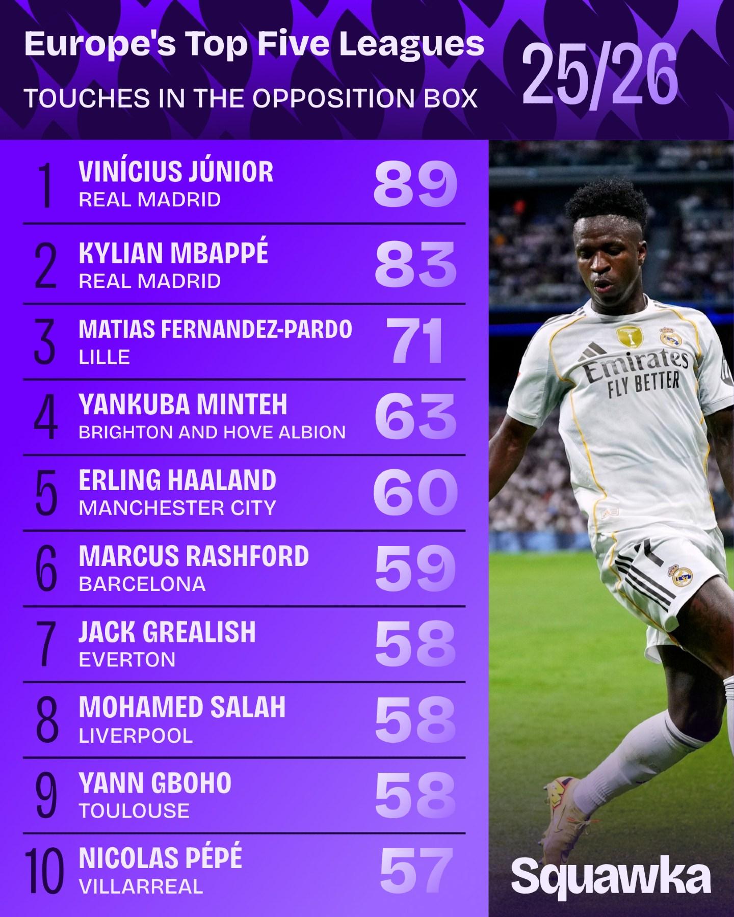 [流言板]本賽季五大聯(lián)賽對(duì)方禁區(qū)觸球榜:維尼修斯第一,姆巴佩第二