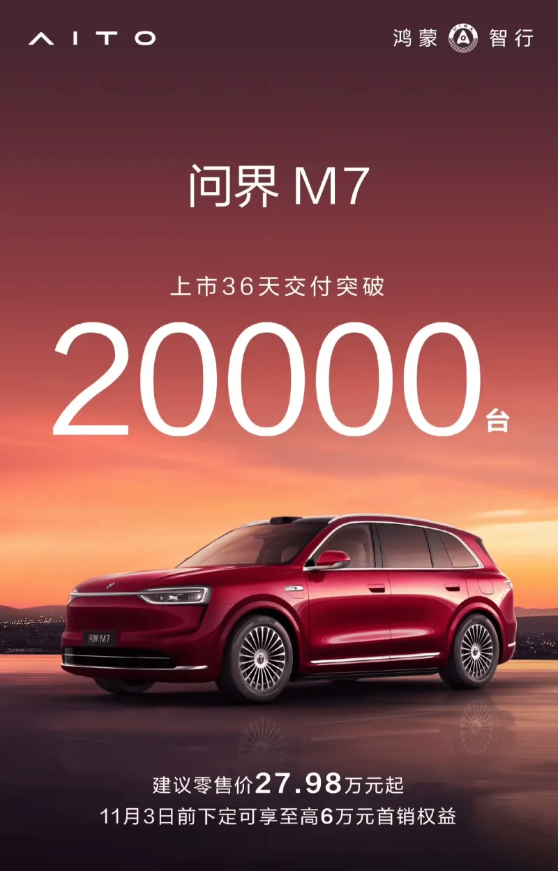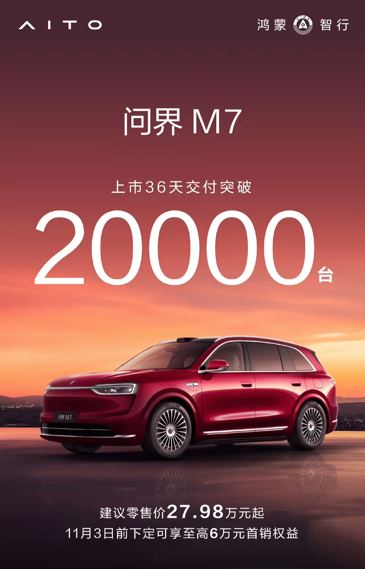 虎撲10月29日訊 根據(jù)鴻蒙智行今天公布的海報,全新問界 M7 上市 36 天,交付量已經(jīng)突破 2 萬臺。