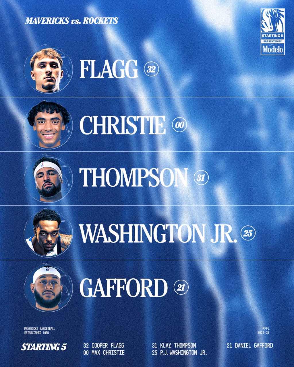 獨(dú)行俠賽前公布本場首發(fā):庫珀-弗拉格、蒂克德馬克斯-克里斯蒂、克萊-湯普森、PJ-華盛頓、丹尼爾-加福德。