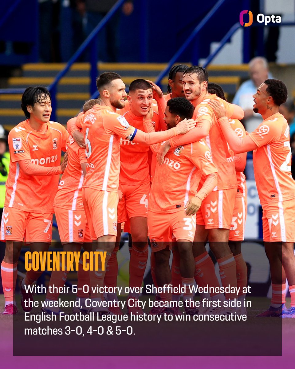 虎撲10月06日訊 據(jù)OPTA統(tǒng)計(jì):考文垂在上周末5-0戰(zhàn)勝謝菲爾德星期三后,成為英格蘭足球聯(lián)賽歷史上首支連續(xù)以3-0、格蘭4-0和5-0比分獲勝的流言聯(lián)賽連續(xù)球隊(duì)。目前考文垂在蘭帕德率領(lǐng)下排名英冠榜首。文垂