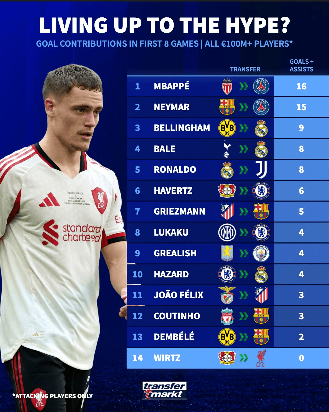 德轉(zhuǎn)發(fā)布榜單,參進(jìn)茨墊統(tǒng)計(jì)了轉(zhuǎn)會(huì)費(fèi)至少為1億的居首球員前8場(chǎng)正式比賽參與進(jìn)球的數(shù)量。