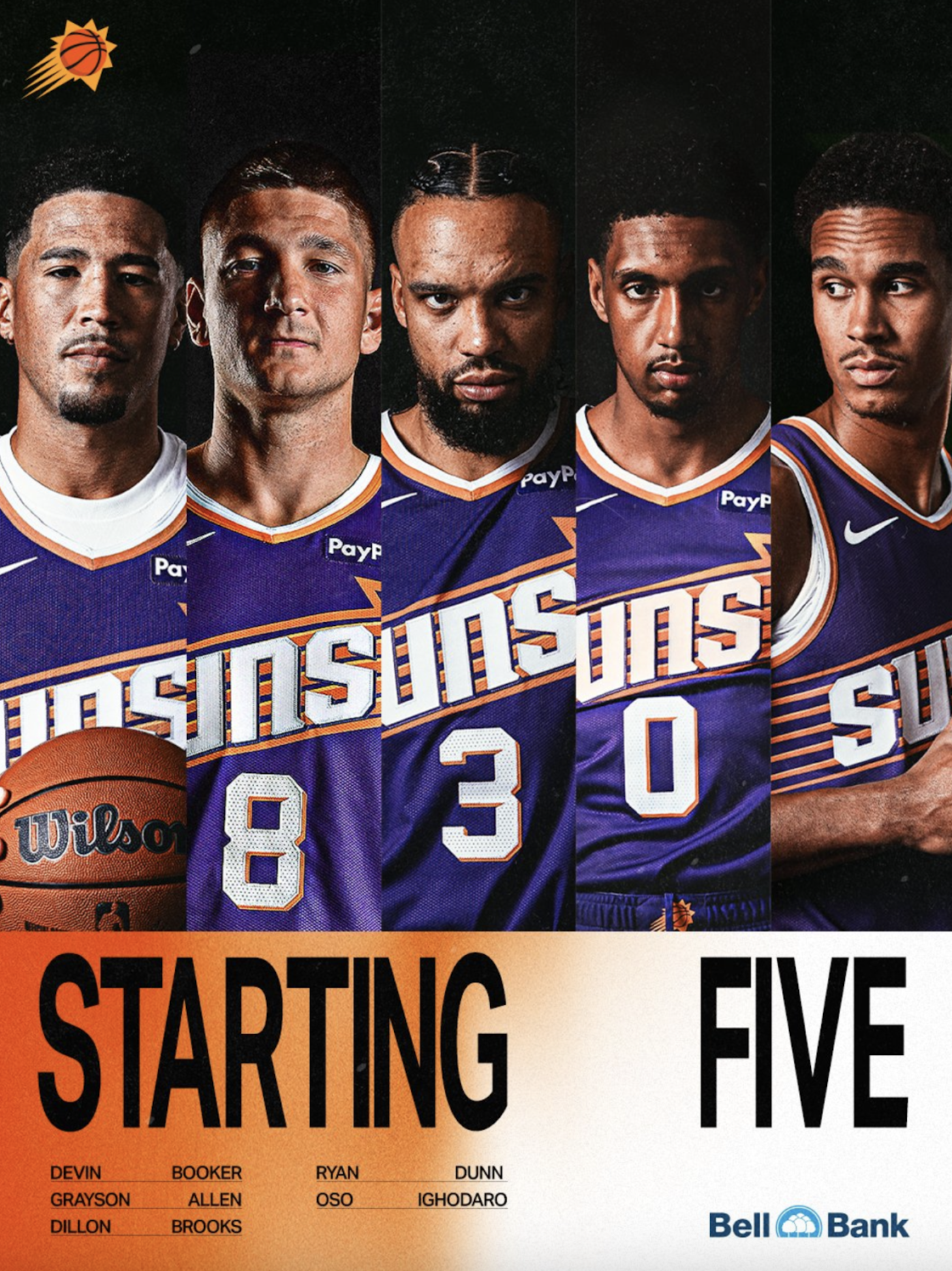具體為:德文-布克、幕戰(zhàn)格雷森-阿倫、陣容瑞安-鄧恩、阿倫狄龍-布魯克斯和奧索-伊戈達羅。