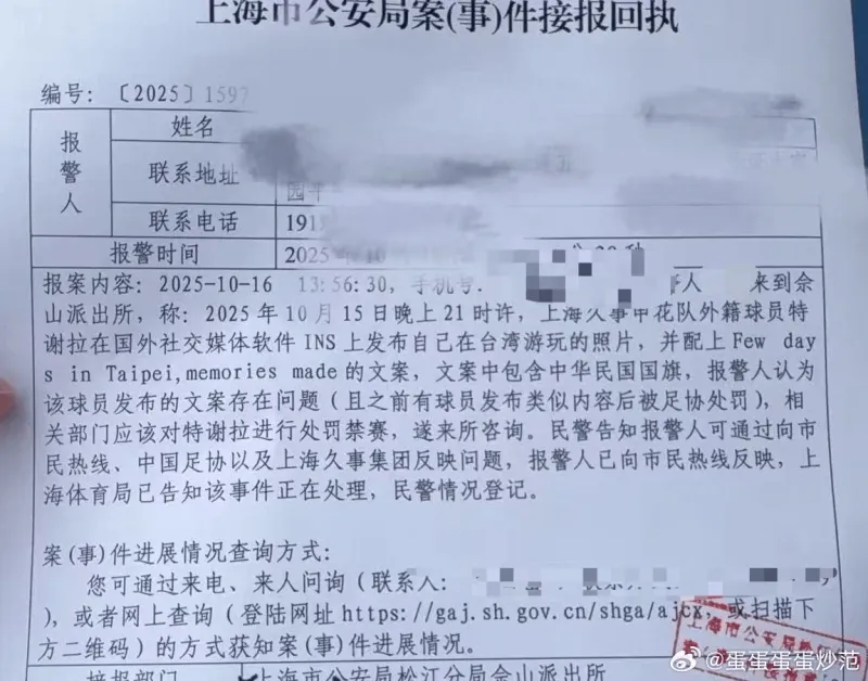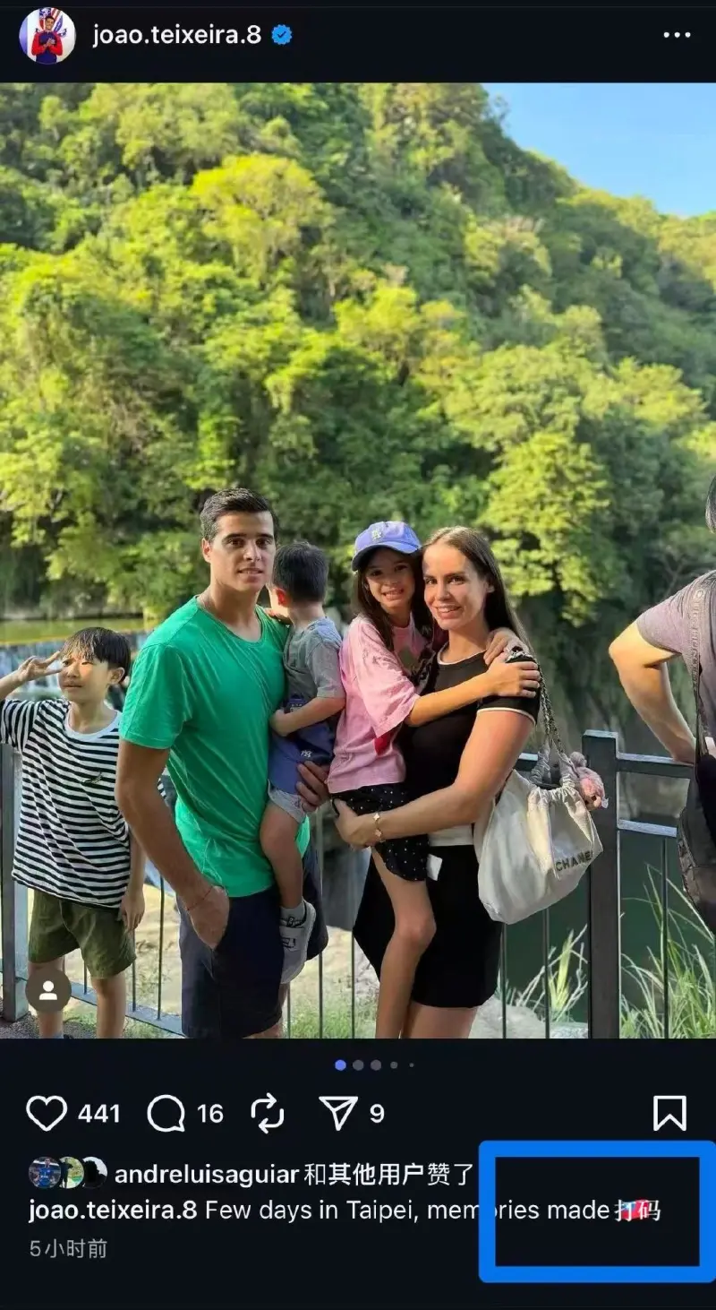 申花外援特謝拉去臺灣省旅游,社媒發(fā)了個(gè)那邊的紅藍(lán)旗